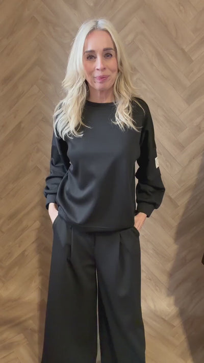 Blød sweatshirt med klassisk rund hals og afslappet pasform. Designet med ribkanter ved ærmer og bund samt diskret detalje på ærmet for et moderne look. Perfekt til både hverdag og afslappede outfits.